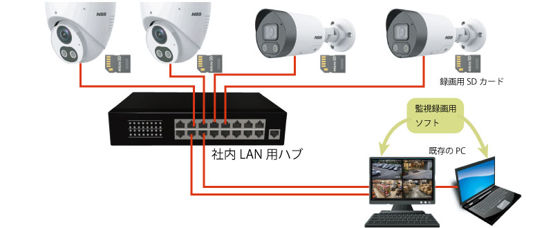 各カメラに装着したSDカードに録画データを保存し、今お使いのパソコンから監視、録画再生を行うことができます